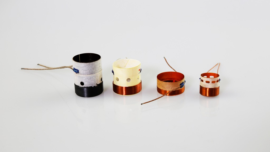 喇叭音圈根據低、中、高音單元的需要而有不同,高音喇叭音圈用十分細的線繞成,包括銅線和鋁線兩種,鋁線質重較輕,可獲得更佳的瞬態響應,但在承載力和耐用性方面不及銅線,中音和低音喇叭多用銅線繞音圈,而且銅線較粗能承受大功率
